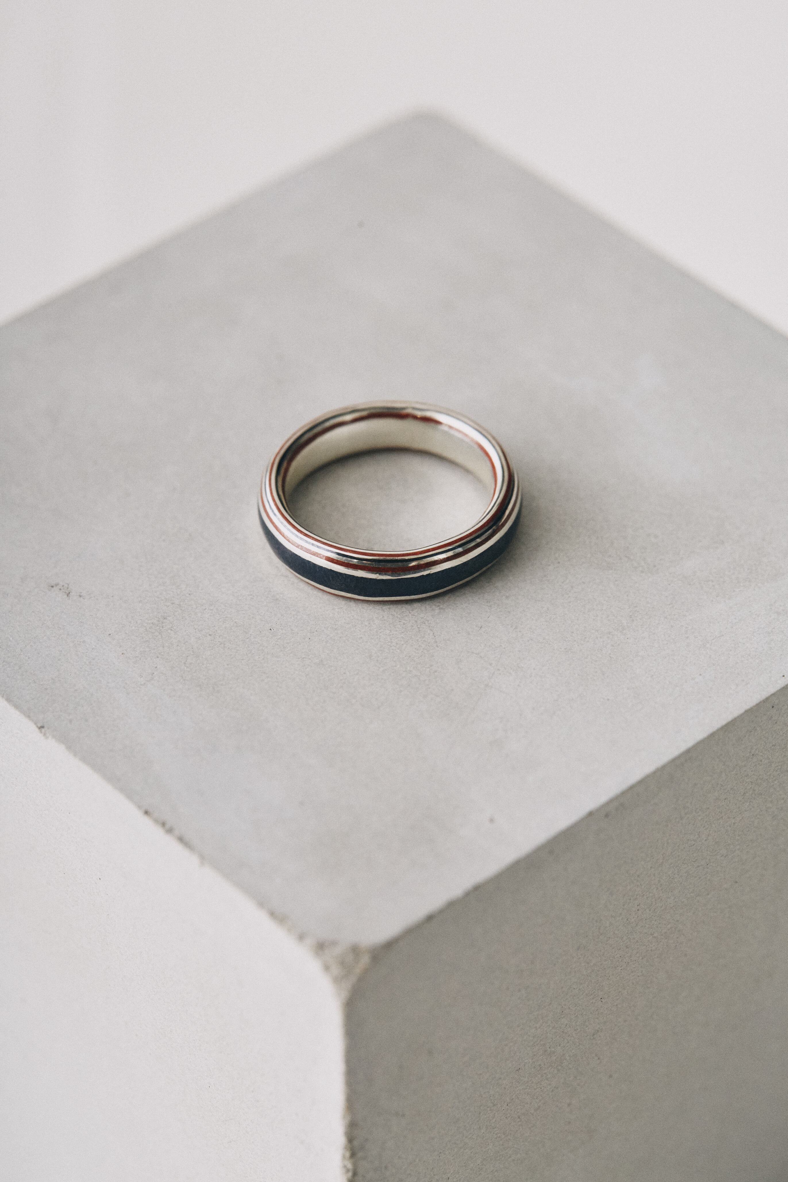 銀と赤銅の木目金で製作したボーダー状のシンプルなリング。